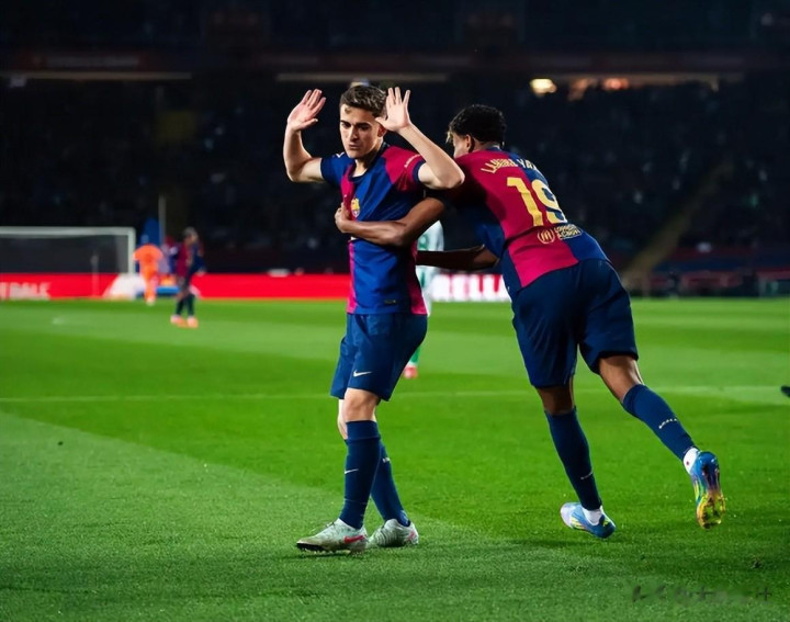 巴塞罗那队球员加维(左)与队友亚马尔庆祝进球