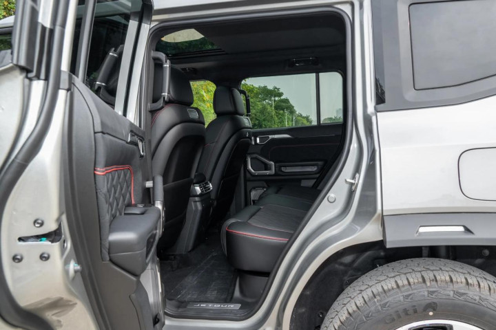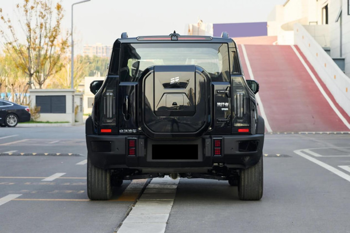 侧面车顶平直,对车内后排空间友好,车辆轴距挺长,前后悬较短,离地间隙高,尾灯采用直瀑贯穿式设计,造型醒目,即便在雨雾等恶劣天气下也能保持良好辨识度。尾门为侧开门,外挂小书包,增添硬派越野气息,后杠突出,车身提供五种基础配色及两种特殊配色,其中公路灰专属哑光漆面质感出众,为整车增添了不少高级感。
