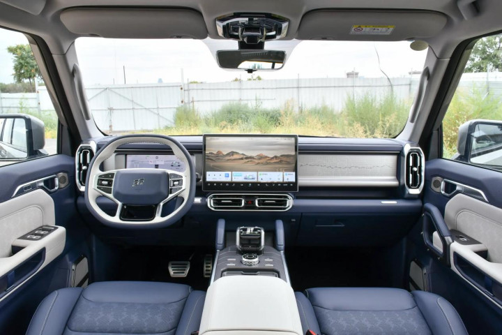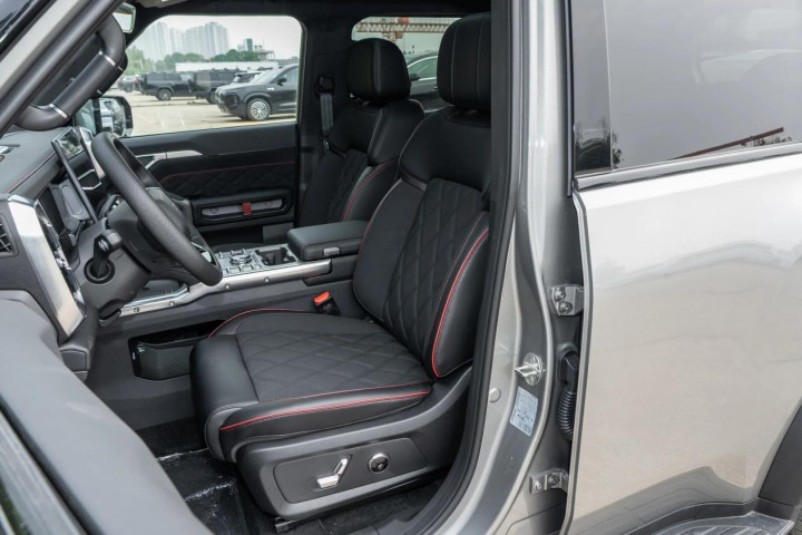 车顶的64英寸全景天窗带来开阔的视野,营造出接近敞篷车的乘坐体验。方向盘采用硬派多功能设计,握感饱满,操作便捷。座椅则是使用菱形格双排缝线工艺,向豪华品牌看齐,不仅美观,也提供了良好的支撑性。此外,车内还提供有国道G318路线饰板,搭配氛围灯、麂皮材质包覆等细节,共同营造出兼具越野气息与豪华质感的内饰氛围。