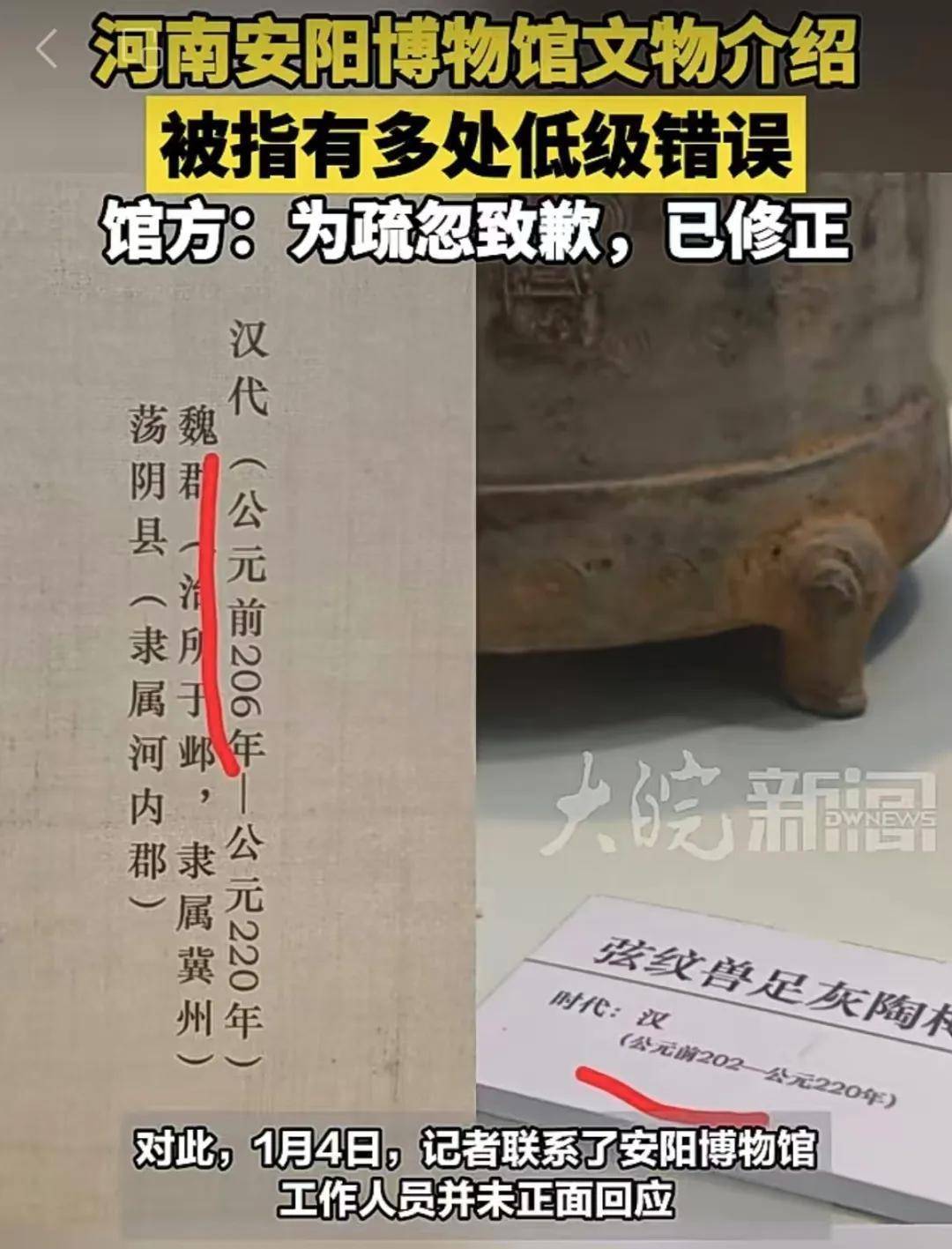 据大皖新闻报道,日前,有网民发帖称,河南安阳博物馆内文物介绍内容存在多处低级错误,引发热议。对此,1月4日,馆方回应称,为疏忽致歉,错误已修正。