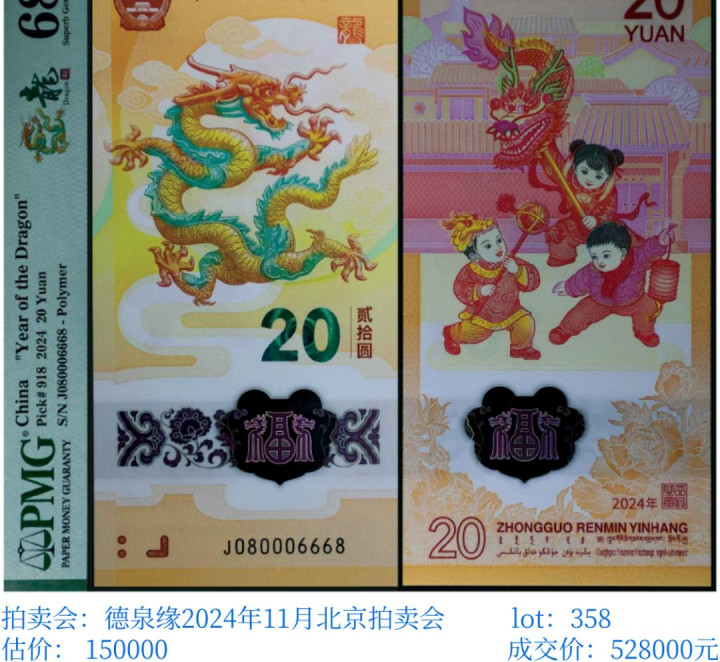 这第二种,是咱们国家2024年才发行的第一张生肖纪念钞——20元龙钞。这可不是普通的纪念品,它是法定货币,能当20块钱花的那种。