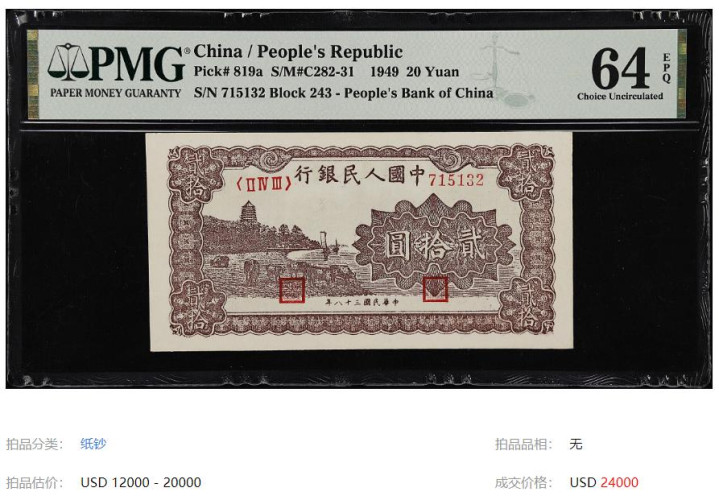 上面这张1949年的“六和塔”20元,人家品相还贼好,你猜估价多少?2万美元!换成咱们的钱,差不多13万8千多!最后成交价还更高,拍出了2.4万美元。这种年份的20元,别说一整张了,就是能见着一面都稀罕。谁家老柜子、旧书里要真夹着这么一张,啥也别说了,赶紧收好,那真是留着传家宝了!